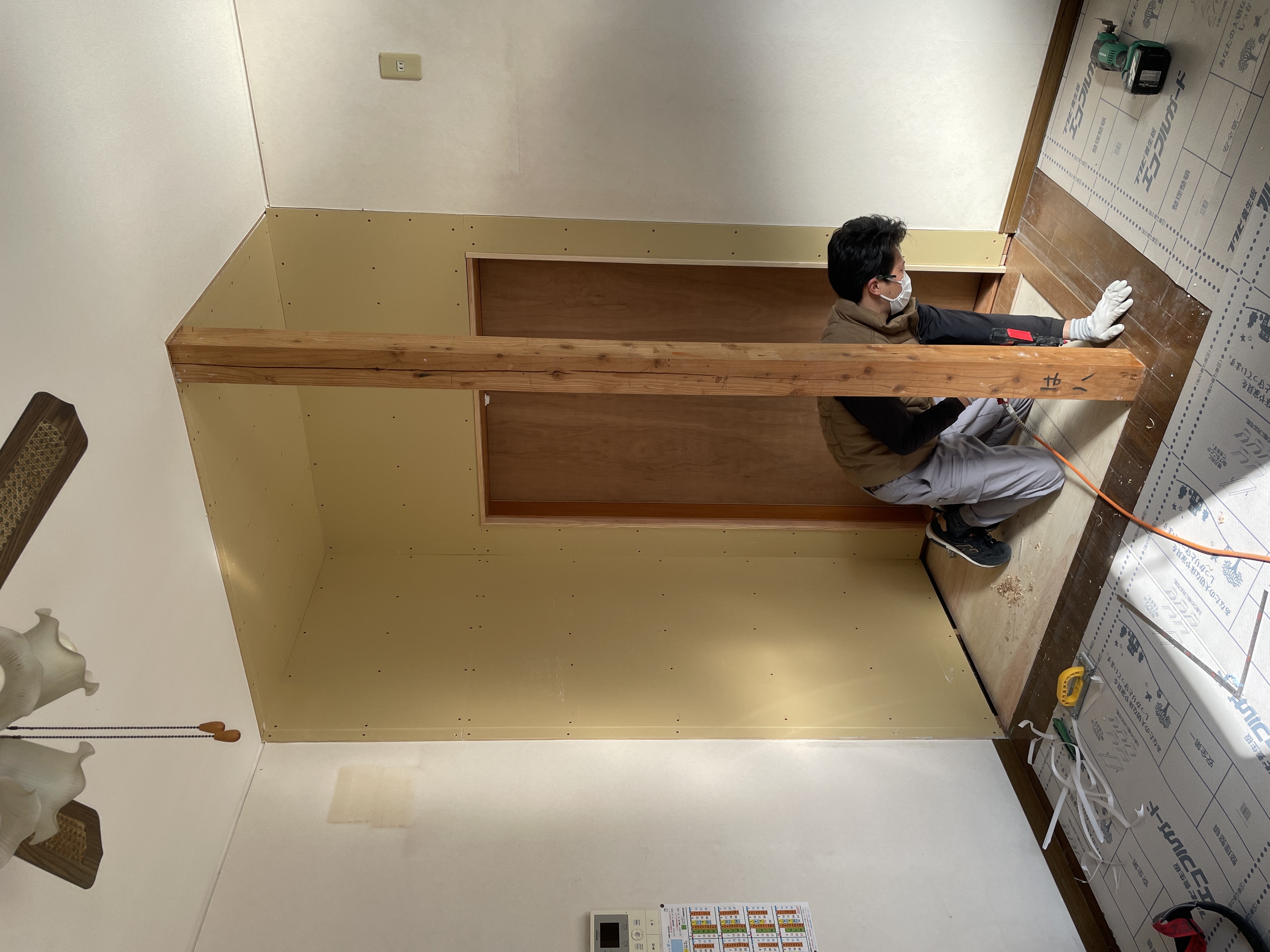 壁を解体後、隣りの部屋と行き来出来るようにします。この壁は押し入れの壁になってます。